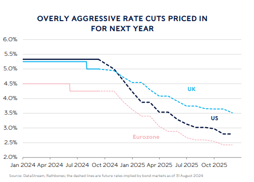 Now, Fed members have been wrong before! Yet so have investors. For now, we think the Fed’s more sedate pace of cuts is the most prudent forecast. While the US jobs market has cooled substantially over the past few months, it’s still nowhere near ‘bad’ territory. And it’s hard to argue that the US economy is tanking either: the last official GDP growth was 3.00% in the second quarter and the unofficial-but-less-lagging ‘nowcast’ estimate from the Atlanta Fed suggests Q3 growth is 2.9%.