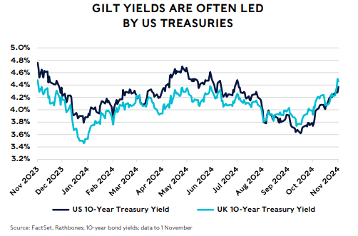 The UK government 10-year yield rose sharply in response to the Budget, with yields breaching 4.5% on the day of release before falling back. At the time of writing, it was trading at around 4.45%. Some of the sell-off may have been driven by concerns that borrowing will end up even larger than planned. For example, tighter spending plans later in the forecast period could struggle to stand up to political pressures.