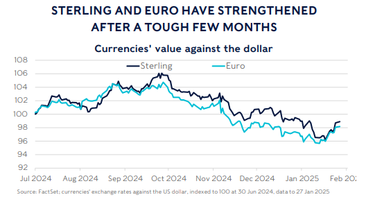 Then, a 25-basis-point cut is expected from the Bank of England next week on Thursday 6 February, which would take the rate to 4.5%. UK 10-year bond yields continued to drop last week in anticipation, albeit only modestly compared with the falls of the previous week. The unemployment rate rose 0.1% to 4.4% last week, but that’s well within a very high margin of error, so it’s impossible to know whether that move was real or just statistical noise.