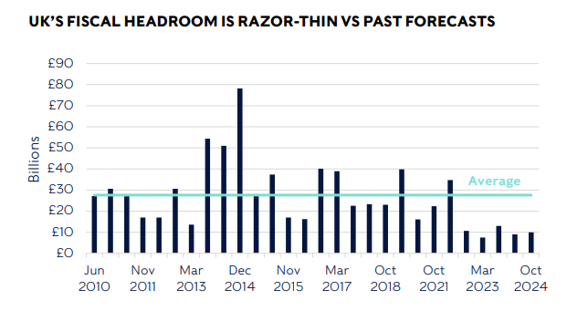 We put the chance of a downturn in the UK slightly higher than in the US, at about 30%. The economy is still eking out marginal growth, but households are glum, businesses restive and the government has little room for manoeuvre within its fiscal rules. Speaking of fiscal rules, the government’s fiscal watchdog, the Office for Budget Responsibility (OBR), is set to give its report card to Parliament on 26 March. It will set out its estimate of current tax receipts and public spending and forecast whether the government is likely to keep to its legally mandated fiscal promises to rein in borrowing and government spending by 2029-30.