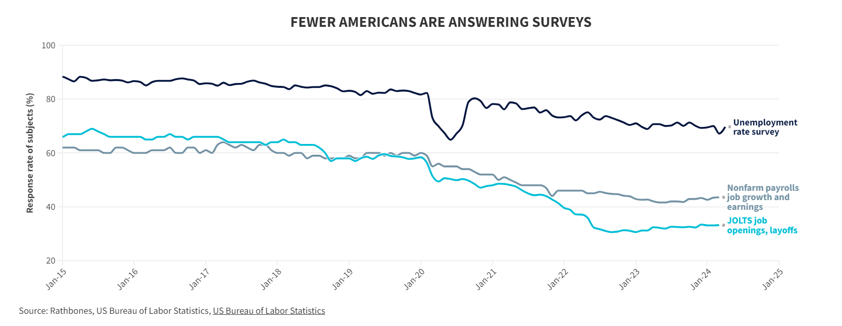 First up, we want to highlight that the US data spooking everyone is not of particularly fantastic quality. Relying on one or two months of numbers and only a couple of different measures to extrapolate the future can be dangerous. Take the labour surveys that report the unemployment rate, jobs growth and earnings: response rates have plummeted in recent years (see chart). This affects the accuracy of the data that comes out the other side. Not only that, but the world is subtly different following the pandemic. We’re living, working and playing differently. That can create what economists call ‘regime change’ – where old statistical relationships are weakened or change entirely. That means old bellwethers for markets may no longer be fit for purpose. In the 1700s, demand for horses was probably a pretty sound indicator of a growing economy. In the 20th century, it was oil. Today, arguably, it could be oil, electricity, or the average screen time we all spend on our smartphones.