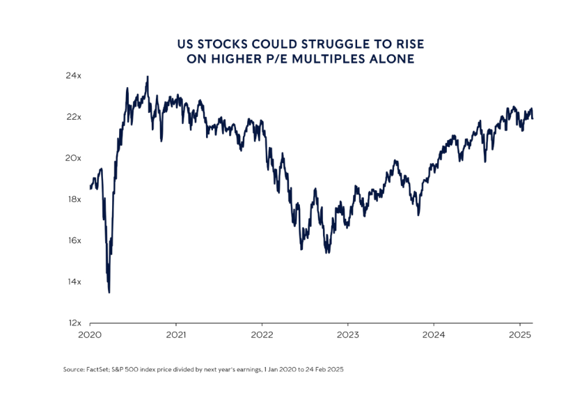 This could easily change as more information tumbles out of the US. But, for now, American stocks will need to rely on better profits to deliver returns to shareholders. Expecting shares to appreciate because investors put a higher value on each dollar of profit (relying solely on a higher price-earnings multiple) will be less rewarding than it has been in the past couple of years.