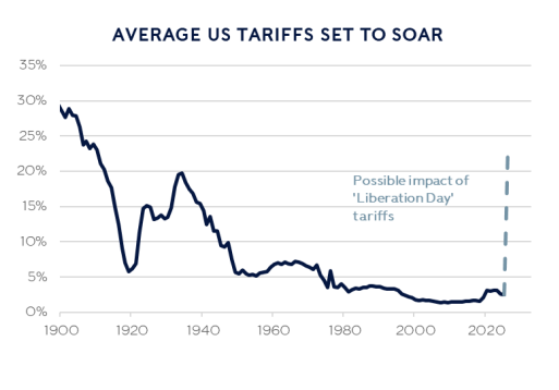 Rather than targeted tariffs on specific countries that could be used as negotiating leverage, Trump unveiled breathtaking increases on virtually all trade and at levels that were much higher than anticipated. The US will tariff all imports at 10%, and all countries that have a ‘trade surplus’ with the US (i.e. that send the US more goods than the US sends to it) will be hit with much higher punitive tariffs. When you tot them all up, we estimate that the average US tariff is set to soar from 3% to 23% virtually overnight. As you can see from the chart, that level hasn’t been seen since the early 20th century.