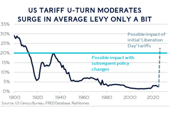 US stocks rallied 5.7% in dollar terms last week, albeit they are still down 8.5% year to date. While the more punitive reciprocal tariffs have been paused for three months to allow negotiations, those levied on Chinese imports were increased in a rapid tit-for-tat that has left Chinese exports to America taxed at 145% and US exports to China at 125%. Also, the 10% universal tariff on all other imports remains in place. While stock investors have taken heart from the reprieve, it is very limited. As you can see from the chart, we estimate the average tariff on imports to America is as high as at the end of the 1930s.