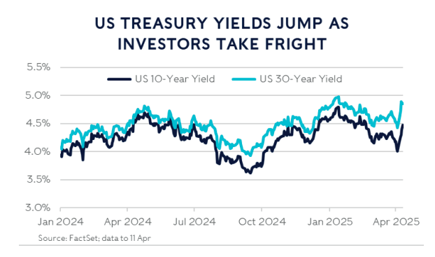 We haven’t included the potential effect of the weekend’s announcement that computer chips, smartphones and computers are exempt from the ‘reciprocal’ tariffs. Which is good, because the administration has already clarified that somewhat (but not a lot, as is their style): US Commerce Secretary Howard Lutnick said these products would instead be subject to tariffs under a different regime solely for high-end electronics that will be revealed in due course. There’s a high chance that this tariff will be at a lower rate than the 145%, and many investors expect substantially lower. We’ll have to wait and see. And see how the opening gambit changes over time, as it is wont to do … So why did Trump relent and pause the tariffs at the last minute? It seems the government bond market was what really got him and his staff worried. Longer-term US treasury bond prices dropped like stones, sending their yields – and therefore government borrowing costs – soaring. While the level isn’t necessarily that high compared with the last year or so, the size and speed of the increase in such a short space of time was extraordinary.